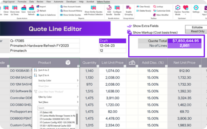 Valorx Fusion overcomes these challenges by elevating the Salesforce CPQ experience. With the ability to manage live Salesforce data directly from Excel, you get to work with the most up-to-date records using the most intuitive data management experience.